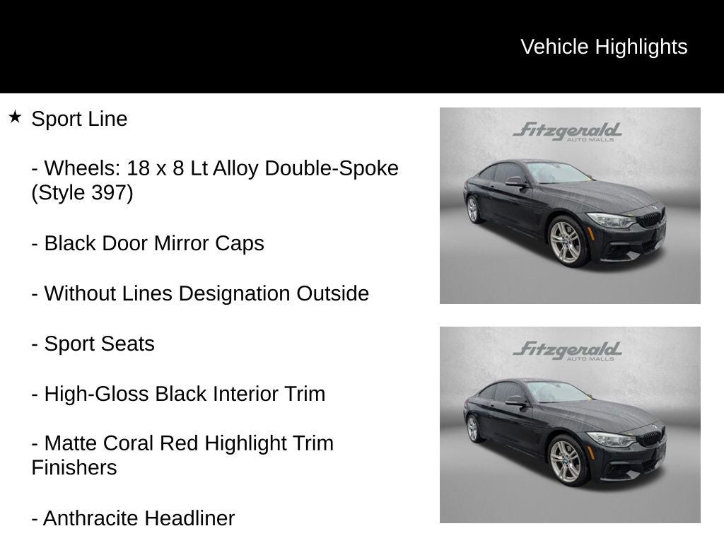 2015 Black Sapphire Metallic BMW 4 Series 8-Speed Automatic Anthracite Headliner, Black Door Mirror Caps, High-Gloss Black Interior Trim, Matte Coral Red Highlight Trim Finishers, Power moonroof, Sport Line, Sport Line Aesthetic Elements, Sport Seats, Wheels: 18 x 8 Lt Alloy Double-Spoke (Style 397), Without Lines Designation Outside. 3.0L 6-Cylinder DOHC 24V Turbocharged 435i xDrive You will love our NO HAGGLE, NO HASSLE PRICING here at Fitzgerald Auto Mall. Ask us about our BUYER PROTECTION PLAN, LOANER CAR PROGRAMS, AND FREE Vehicle History Report. Can not find what you want?? NO PROBLEM! We have over 1,000 Pre-Owned vehicles available at WWW.FITZMALL.COM. You can also visit us in person at 114 Baughmans Lane Frederick MD, 21702 or Call Us @240-629-7301.