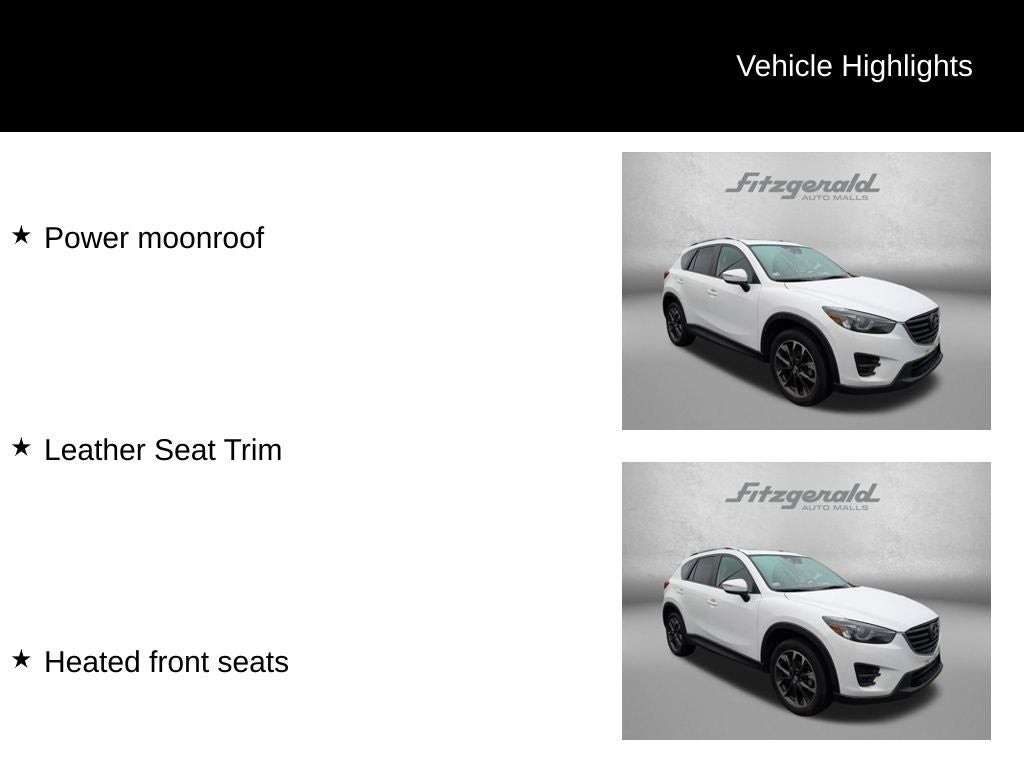 2016 Crystal White Pearl Mica Mazda CX-5 6-Speed Automatic Heated front seats, Leather Seat Trim, Power moonroof. SKYACTIV® 2.5L 4-Cylinder DOHC 16V Grand Touring You will love our NO HAGGLE, NO HASSLE PRICING here at Fitzgerald Auto Mall. Ask us about our BUYER PROTECTION PLAN, LOANER CAR PROGRAMS, AND FREE Vehicle History Report. Can not find what you want?? NO PROBLEM! We have over 1,000 Pre-Owned vehicles available at WWW.FITZMALL.COM. You can also visit us in person at 114 Baughmans Lane Frederick MD, 21702 or Call Us @240-629-7301.