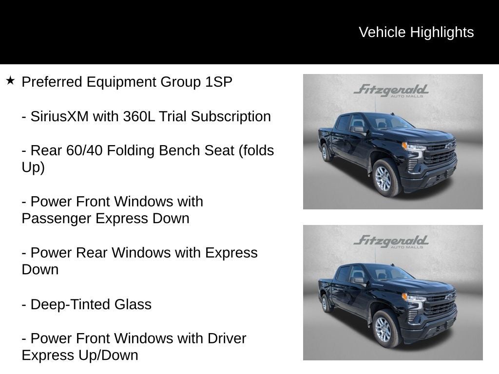 2026 Black Chevrolet Silverado 1500 10-Speed Automatic 10-Speed Automatic, 4WD, Black Cloth, 10-Way Power Driver Seat with Lumbar, 12.3 Multicolor Reconfigurable Digital Display, 120-Volt Bed Mounted Power Outlet, 120-Volt Interior Power Outlet, 40/20/40 Front Split-Bench Seat, 6-Speaker Audio System, All-Star Edition, Auto-Locking Rear Differential, Bluetooth® For Phone, Cloth Seat Trim, Color-Keyed Carpeting Floor Covering, Convenience Package, Deep-Tinted Glass, Dual Rear USB Ports (charge Only), Dual-Zone Automatic Climate Control, Electric Rear-Window Defogger, Electronic Cruise Control, EZ Lift Power Lock and Release Tailgate, Front Frame-Mounted Black Recovery Hooks, Front LED Fog Lamps, Front Rubberized Vinyl Floor Mats, HD Rear Vision Camera, Heated Driver and Front Outboard Passenger Seats, Heated Power-Adjustable Outside Mirrors, Heated Steering Wheel, High Gloss Black Mirror Caps, Hitch Guidance, Inside Rearview Mirror with Tilt, Integrated Trailer Brake Controller, Keyless Open and Start, LED Cargo Area Lighting, Manual Tilt/Telescoping Steering Column, OnStar Services Capable, Power Front Windows with Driver Express Up/Down, Power Front Windows with Passenger Express Down, Power Rear Windows with Express Down, Preferred Equipment Group 1SP, Rear 60/40 Folding Bench Seat (folds Up), Rear Rubberized-Vinyl Floor Mats, Remote Vehicle Starter System, SiriusXM with 360L Trial Subscription, Standard Suspension Package, Standard Tailgate, Steering Wheel Audio Controls, Teen Driver, Theft Deterrent System (unauthorized Entry), Tire Pressure Monitoring System, Trailering Package, Wheels: 18 x 8.5 Bright Silver Painted Aluminum, Wi-Fi Hot Spot Capable, Wrapped Steering Wheel. EcoTec3 5.3L V8 RST You will love our NO HAGGLE, NO HASSLE PRICING here at Fitzgerald Auto Mall. Ask us about our BUYER PROTECTION PLAN, LOANER CAR PROGRAMS, AND FREE Vehicle History Report. Can not find what you want?? NO PROBLEM! We have over 1,000 Pre-Owned vehicles available at WWW.FITZMALL.COM. You can also visit us in person at 114 Baughmans Lane Frederick MD, 21702 or Call Us @240-629-7301.
